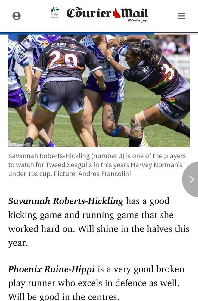 In rugby league, Savannah developed through the Harvey Norman Under 19s with the Tweed Seagulls and earned back-to-back NSW Koori Knockout titles. Her consistency and work ethic secured her a place in the Gold Coast Titans Elite Pathways Program (2023–2024) and an NRLW Development Interim Contract (2024–2025). In 2025, she was selected for the Westpac Female U19 NSW Country squad, further cementing her status as one of the most promising young talents in the game. Known for her explosive power and defensive intent, she thrives in structured systems and brings a team-first mindset to every game.
